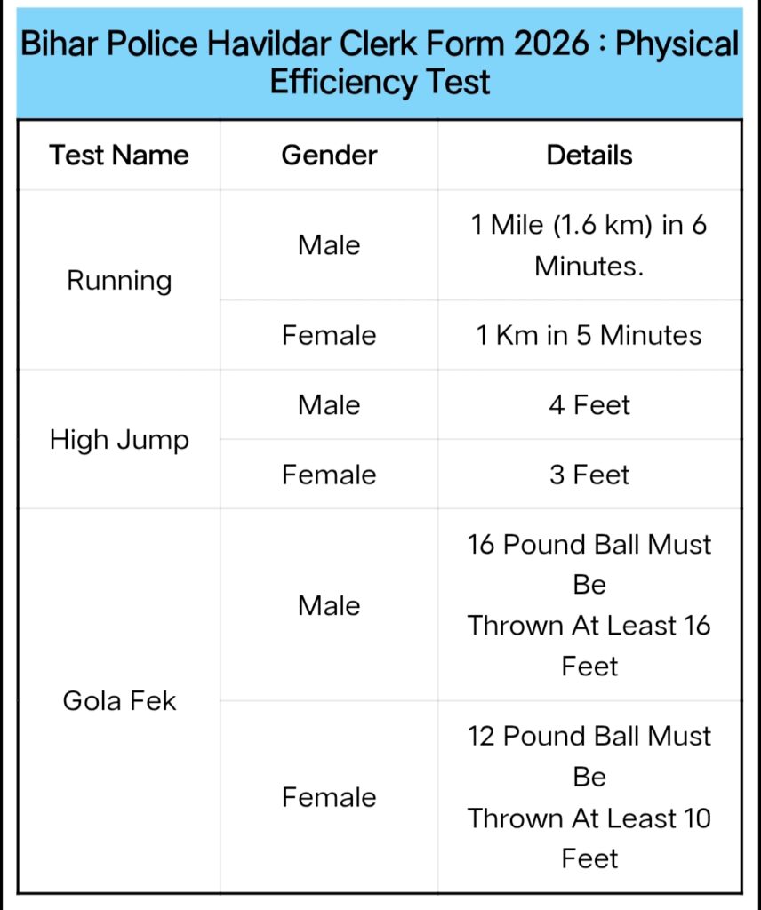 Bihar Police Havildar Clerk Form 2026:Physical Efficiency Test